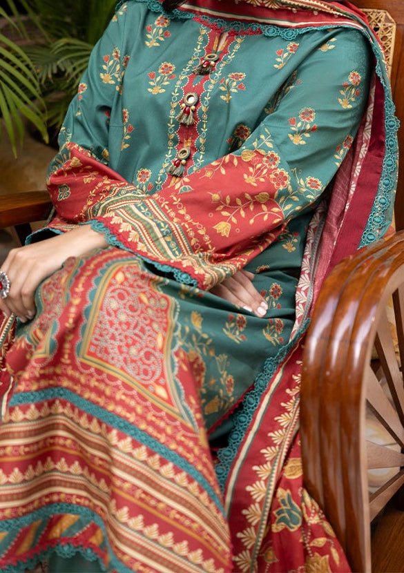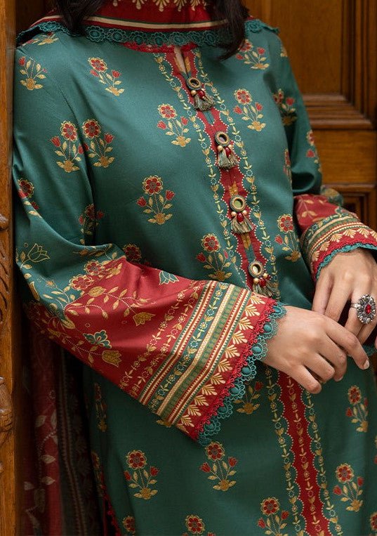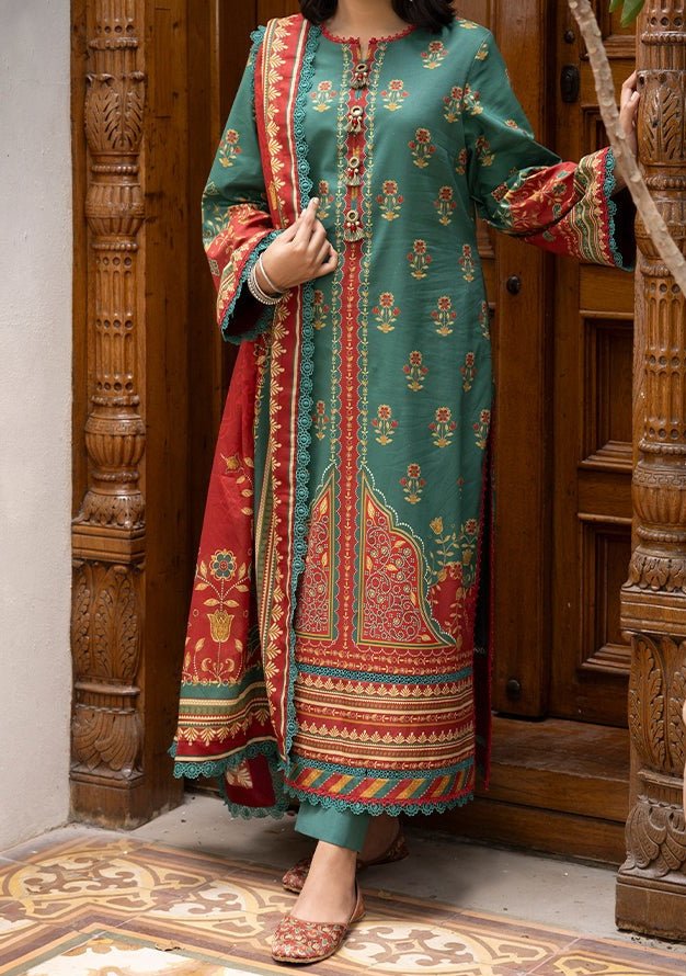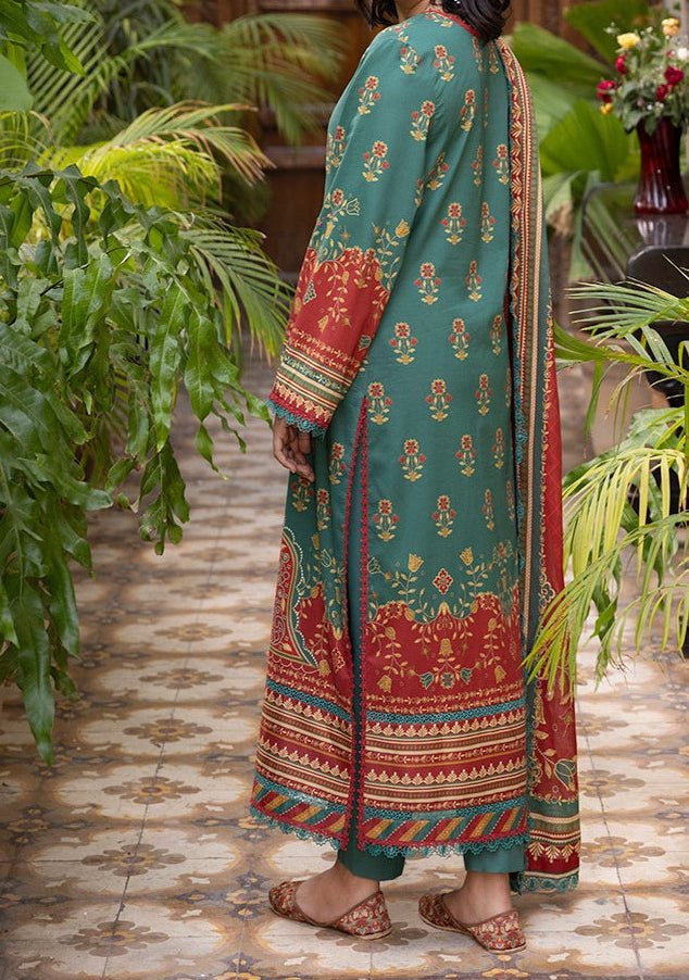 Introducing our New collection, 'Asim Jofa Prints' by Asim Jofa designed to make you look and feel your best. Embrace heritage with a flourish. This captivating green ensemble, blended with the beauty of red, features intricate South Asian motifs, paired with a flowing dupatta to complete your look. Perfect for festive soirees.