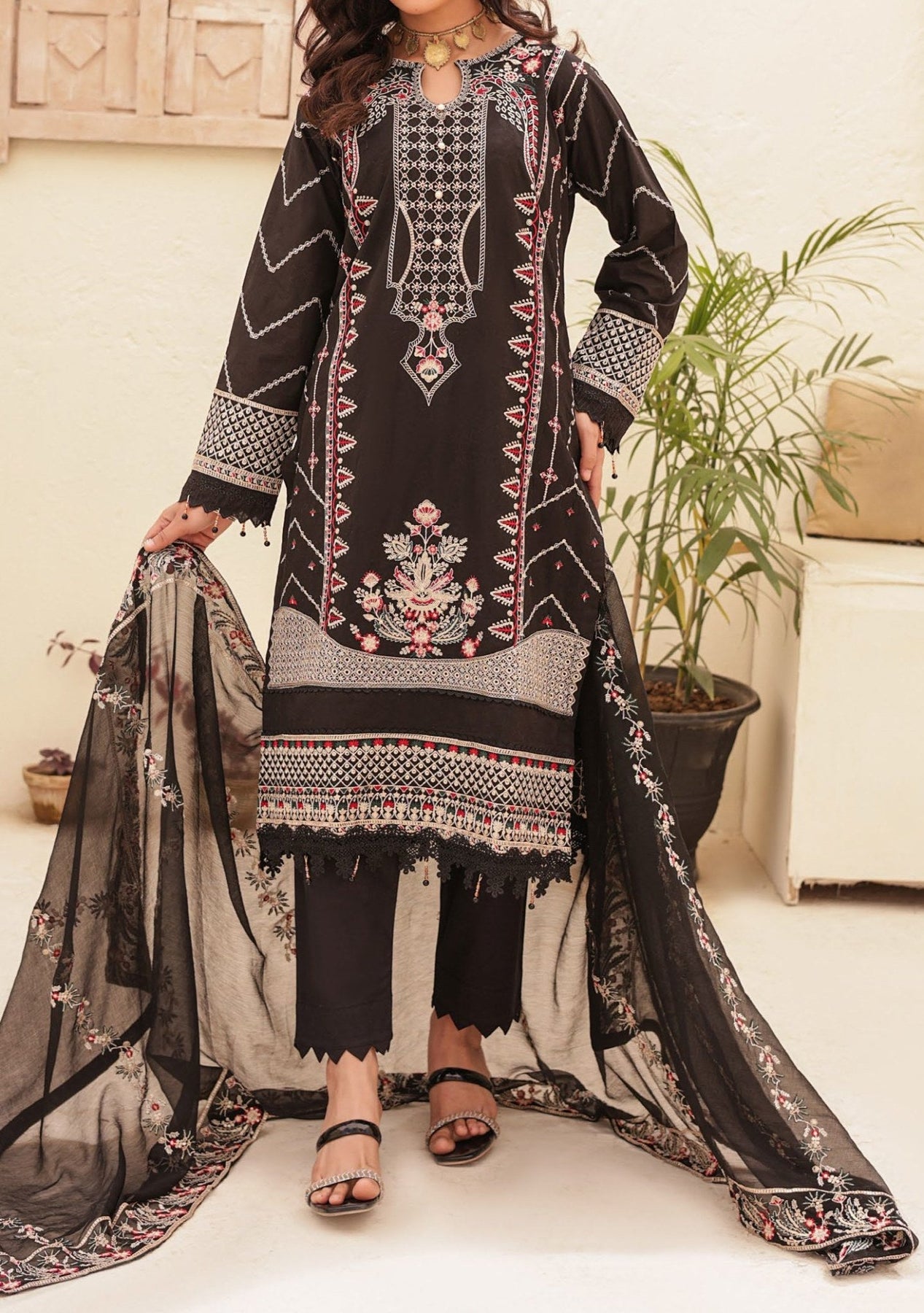Includes: Ready-Made Kameez, Trouser, Dupatta.