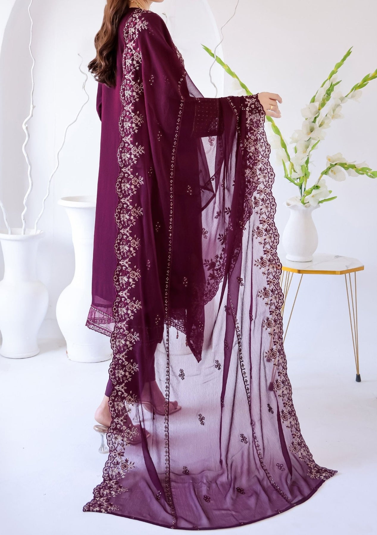 - Embroidered Chiffon Dupatta With Border Work.